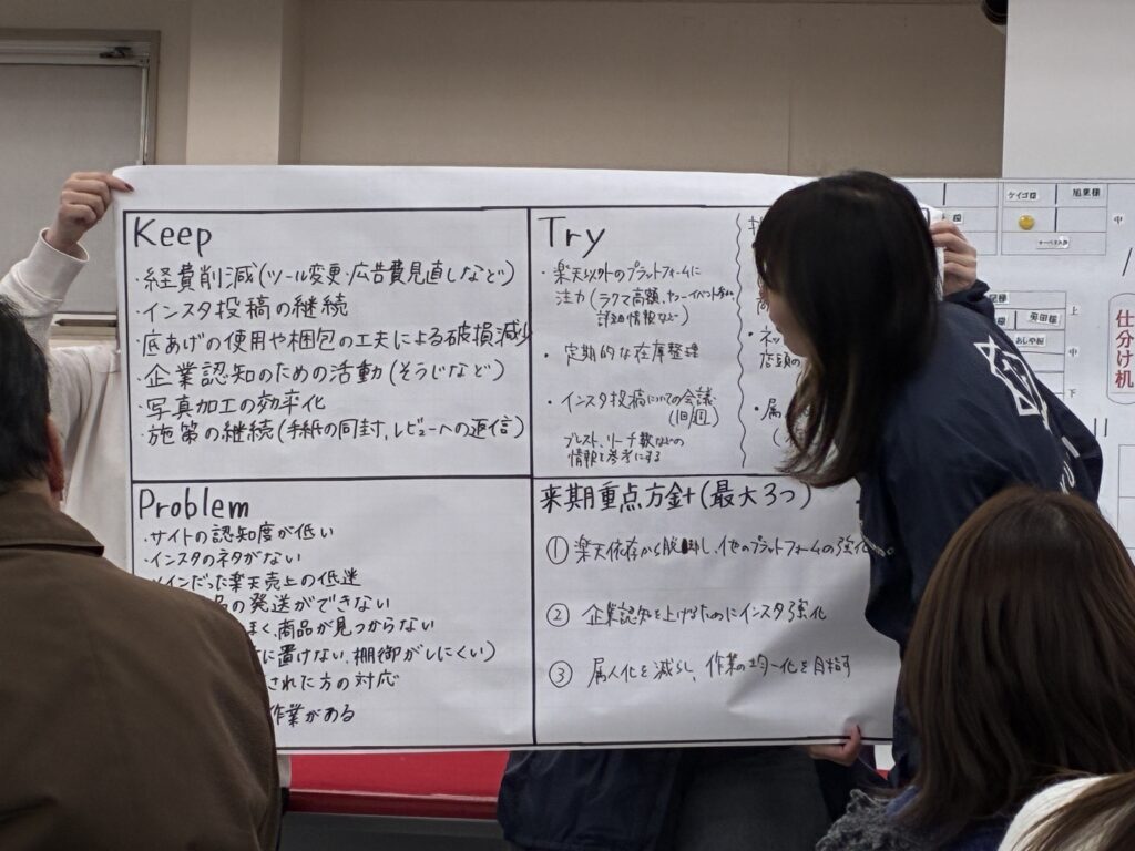 3つのグループに分かれ、日々の業務における「Keep(継続)」「Problem(課題)」「Try(挑戦)」を出し合いました。役職に関わらず、フラットに意見が飛び交う時間となりました。