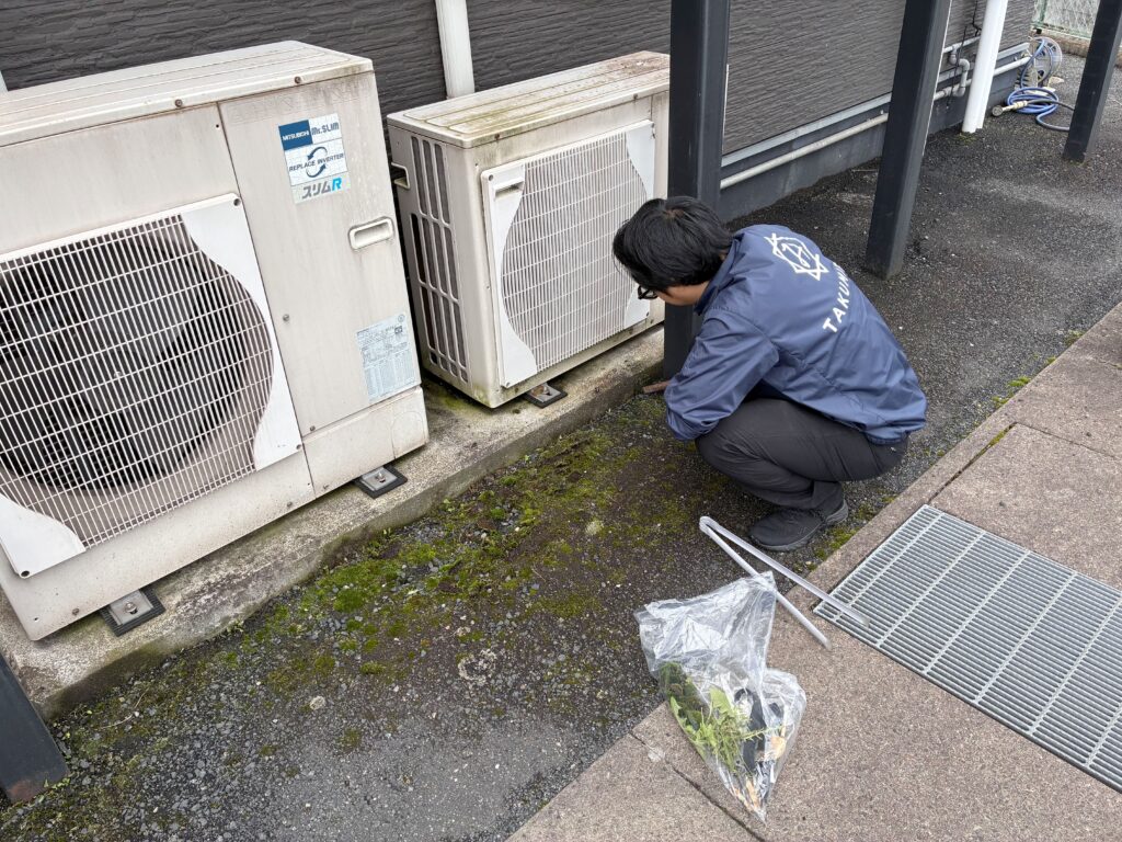 今回は店舗周辺の歩道を中心に、タイルの隙間に生い茂った雑草の除去や、側溝に溜まった細かなゴミの回収を重点的に行いました。